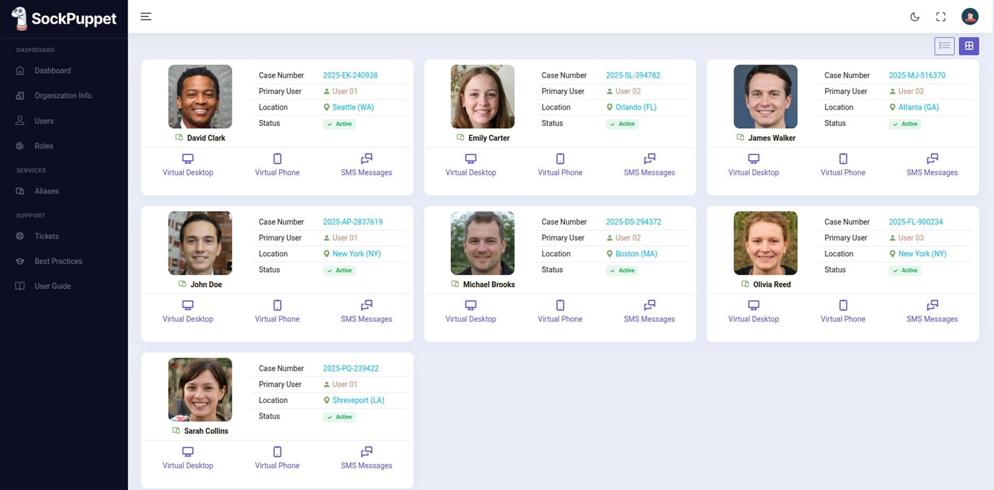 SockPuppet equips corporate risk, fraud, and insider threat teams with secure, unattributed digital environments to investigate suspicious behavior, validate abuse, engage with threat actors when needed, and view corporate platforms from multiple global perspectives — safely and efficiently.